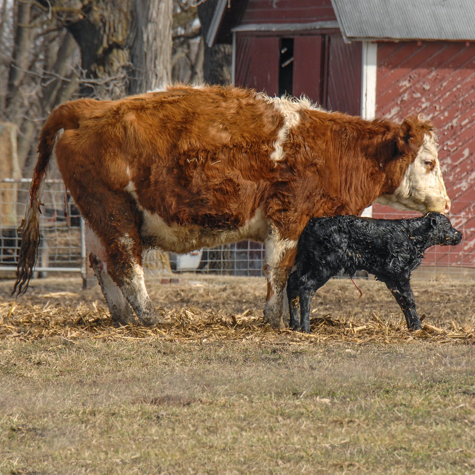 While driving around a rural area near Ames, I noticed a cow in a pasture with others, that was off in one corner by herself, while the others were many hundreds of feet away. I stopped and looked, only to see a black mass on the ground next to the standing cow. Being a farm boy I realized she had just given birth to a new calf minutes before I noticed her, as part of the placenta was visible on the cow, and some of the umbilical cord of the calf was evident as well. I knew the cow would soon try to get the new calf up on its feet to move around, and to soon find some warm milk. I sat there for a half hour taking nearly 200 images as the newborn got its “legs” and bearings, and was guided for a milk run by its mother. With lots of nudges, and body turns she kept directing the calf back to the milk supply, and finally he found it and was soon having his first warm meal!